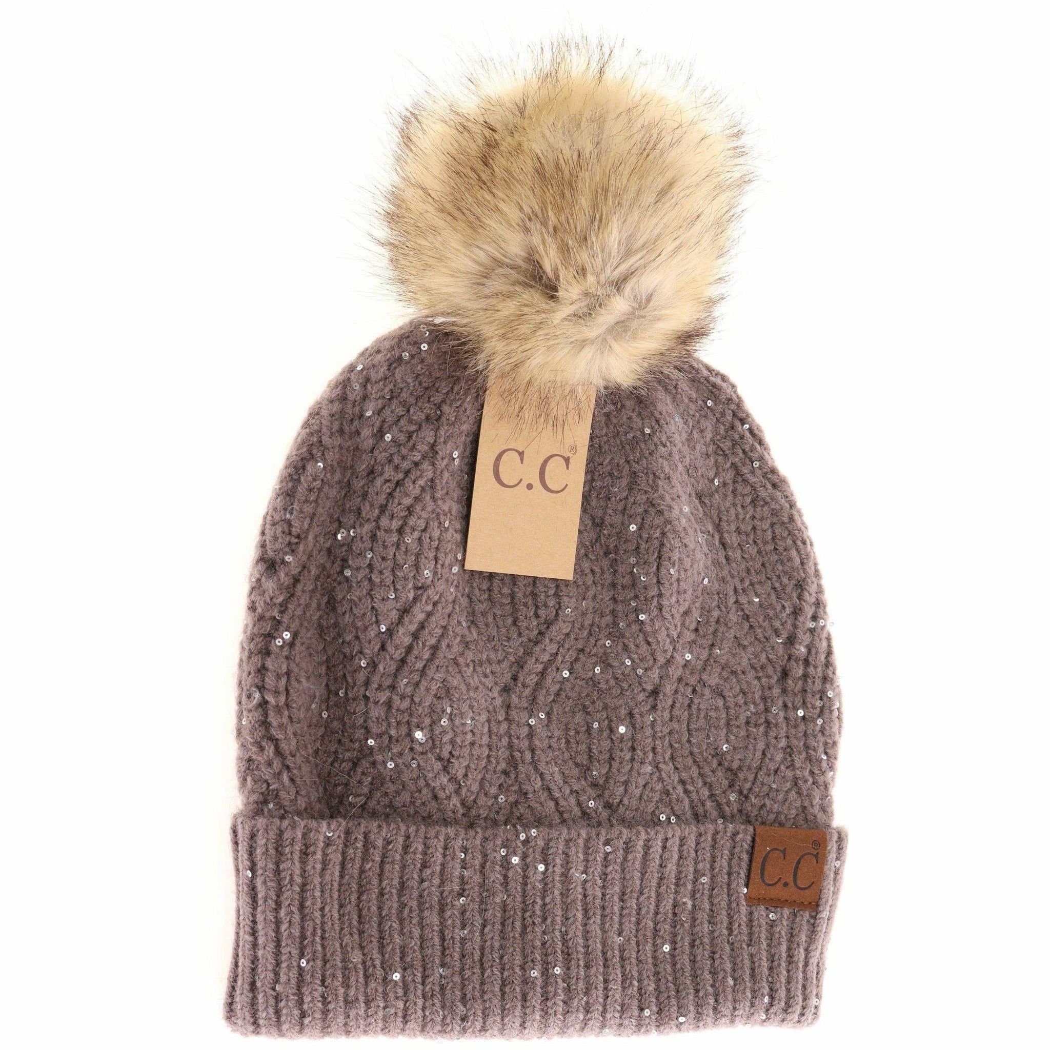 Sequin Brioche Cable Knit Fur Pom C.C Beanie: Earth Grey
