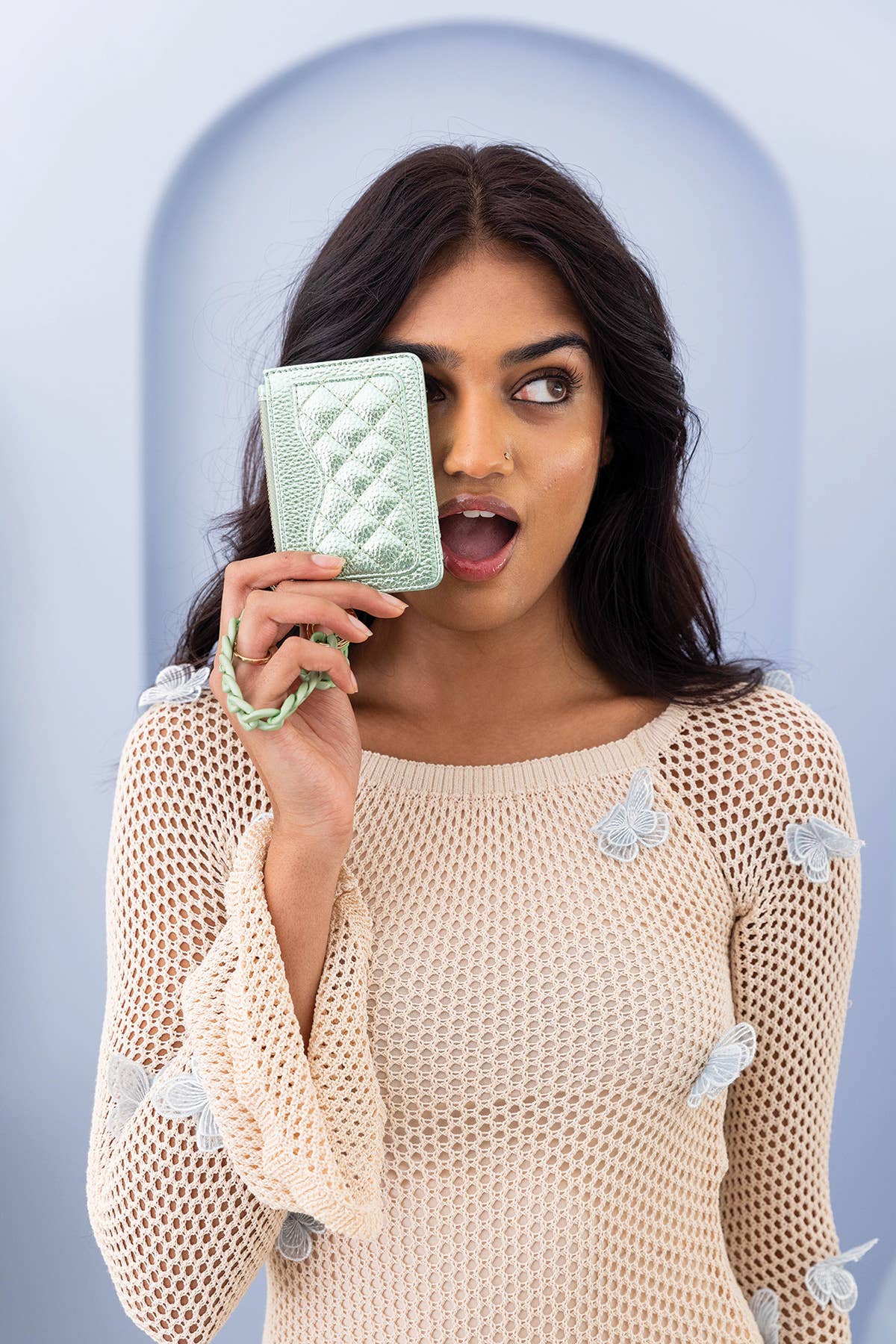 Item Details: -Style: Rhodes Quilted Wallet with Chain Bangle -Type: Wallet -Front Pocket: Quilted -Interior: Card Slots, Top Zipped Compartment -Strap: Acrylic Wristlet Strap -Hardware: Gold or Silver-tone (As Pictured) -Material: Vegan Leather Dimensions: -Length: 4.5 Inches -Height: 3 Inches This stylish wallet features a quilted front pocket for added texture and appeal. It includes convenient card slots and a top-zipped compartment to keep your essentials secure. The acrylic wristlet strap adds a modern touch, while the choice of gold or silver-tone hardware complements the design. Crafted from vegan leather, it's both stylish and cruelty-free.