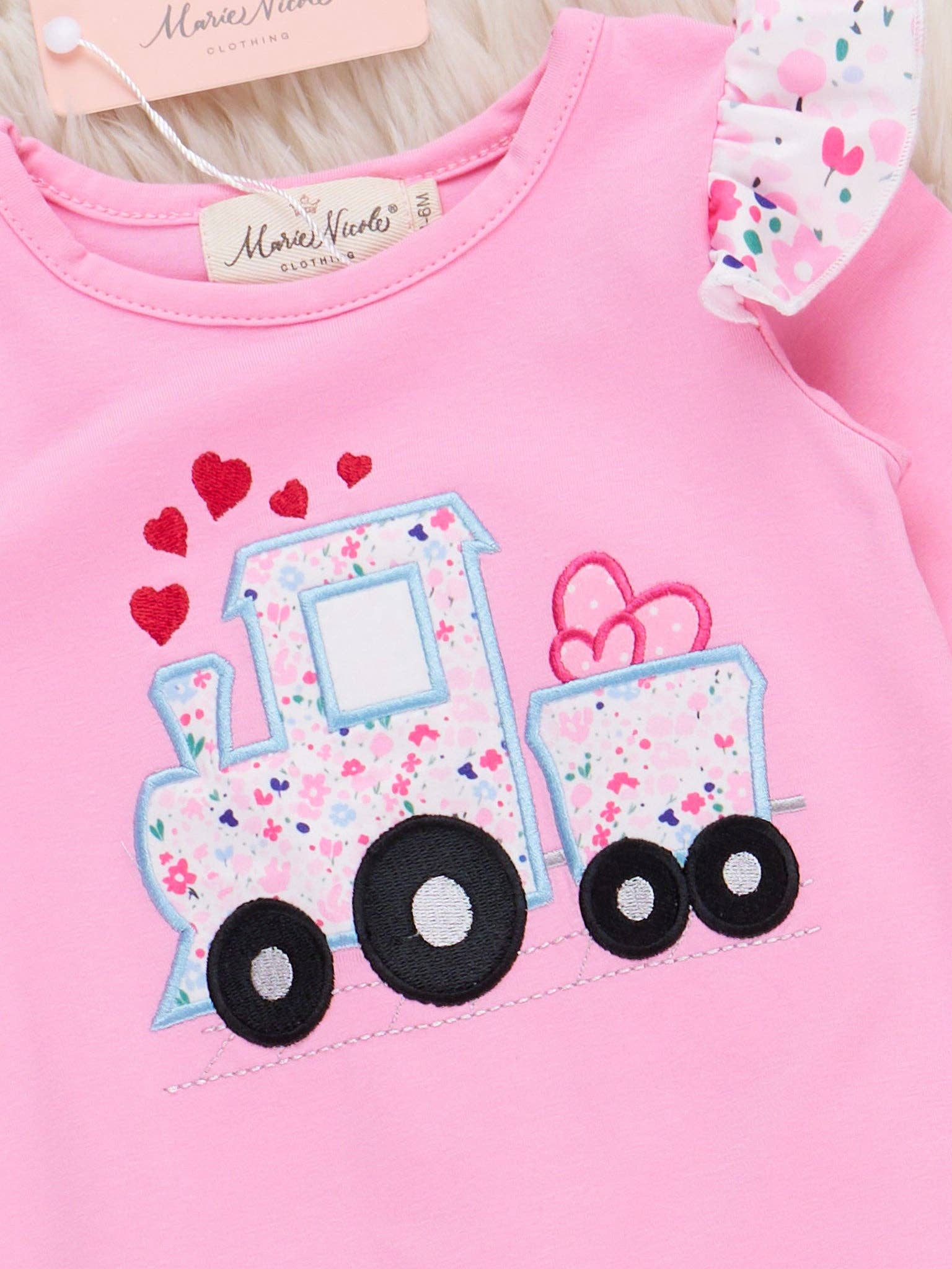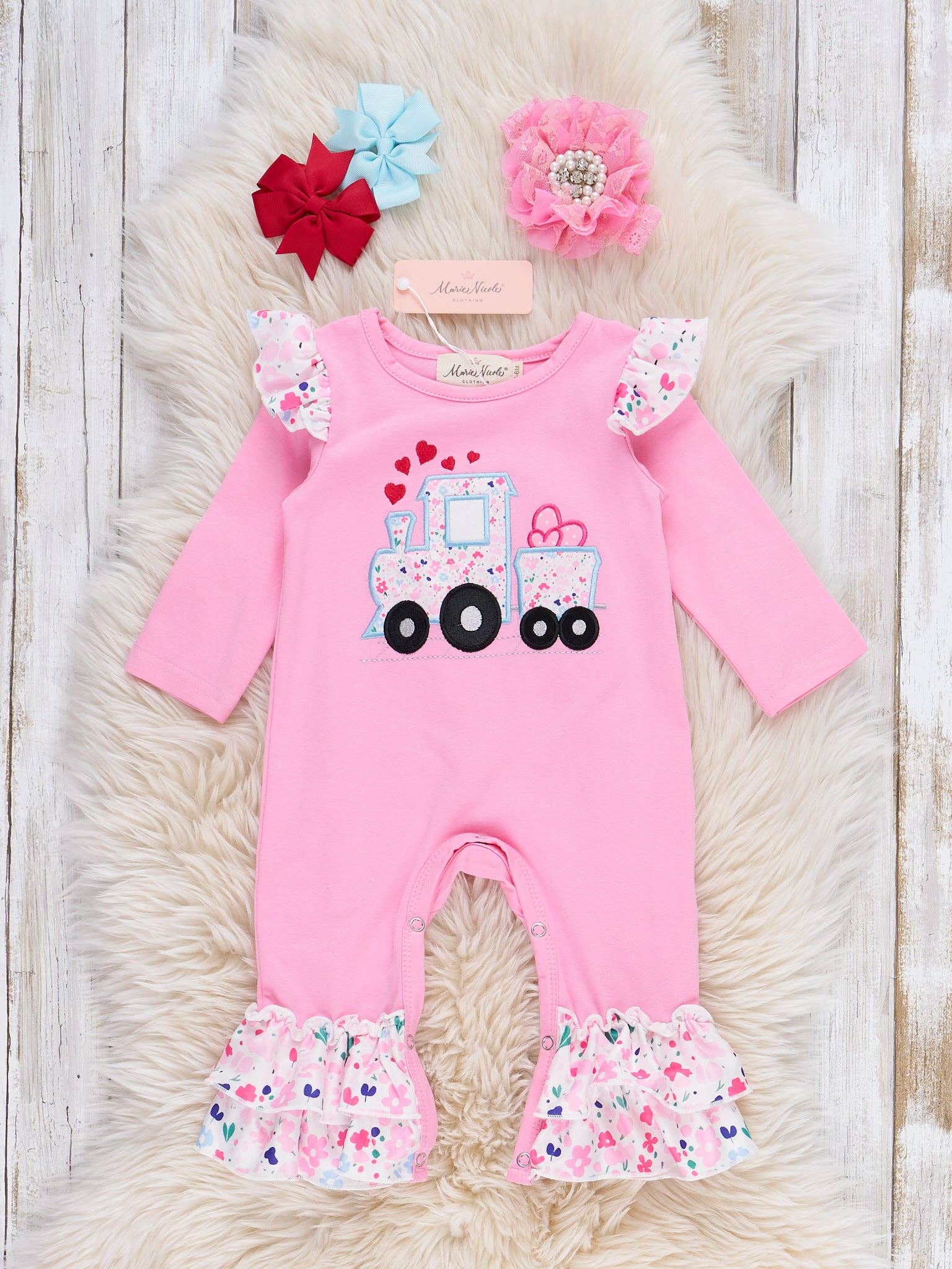 Love Delivery Floral Embroidered Ruffle Romper by Marie Nicole Clothing features a charming truck applique with heart details, floral accents on the flutter sleeves and ruffle cuffs, and a playful silhouette. This darling romper is perfect for occasions that celebrate love and joy, bringing a festive Valentine's Day spirit to any special day or seasonal gathering.