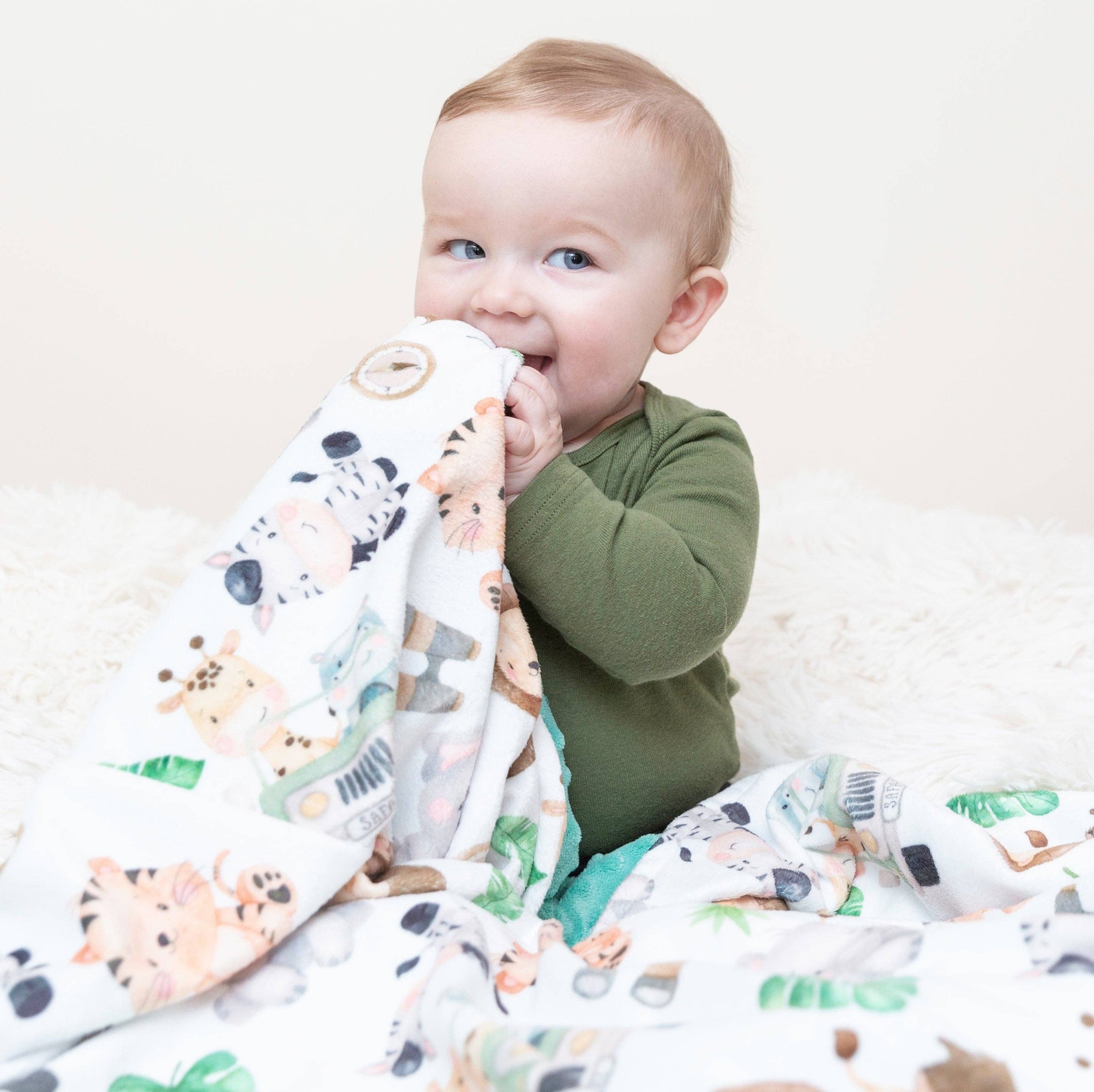 This safari blanket is becoming one of our customer's favorite! It's our own unique design/pattern so you don't see it everywhere. Details: - Premium Quality: 100% minky (polyester) on both sides to provide only the softest touch for baby's delicate skins. - Generous Size: 30x40 inches (great for 0-3 yr old) - Vibrant colors with a beautiful design on one side and the popular minky dot texture on the other. - Machine washable (wash cold and tumble dry low). - Each blanket is tied with a cream color ribbon and packaged individually.