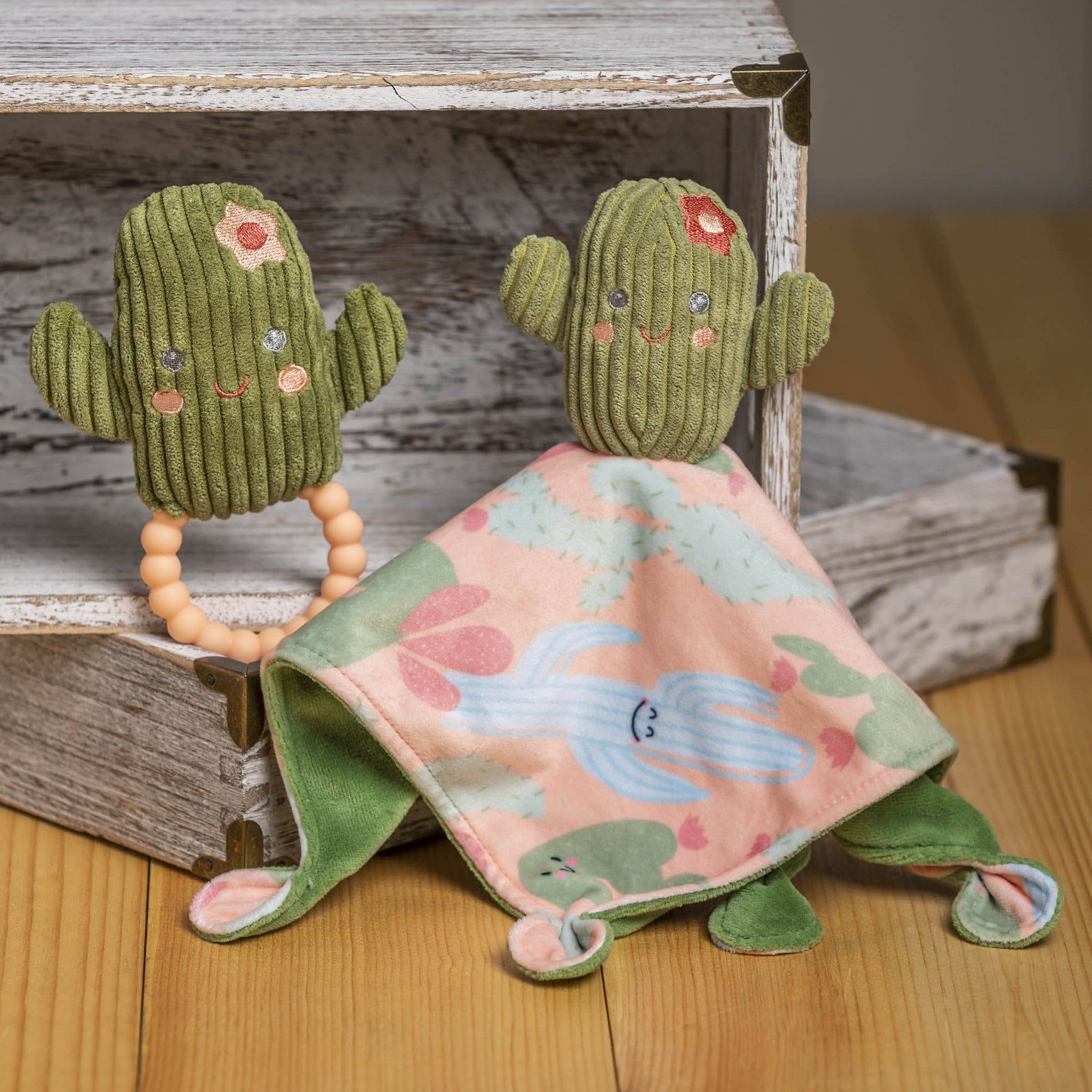 Happy Cactus Sweet Soothie Teether Rattle. As much fun for Mom as for baby, Sweet Soothies combine familiar everyday objects with sweet smiling faces to give them personality. Clever little teether rattle for sore gums and anxious ears. Our wildly soft characters connect with the baby while the teether and rattle bring much-needed comfort. Rattle on the inside, silicone beaded teether on the outside soothes and stimulates. Great impulse item for the registration area. This cutie has embroidered rosy cheeks, a flower on top, and arms stretched out for a hug. Measures approximately 5-inches tall. The value price point has broad appeal. Coordinates with matching blanket. Care for by washing in cold water on a gentle cycle, air drying; soft toy made to strict quality standards to meet or exceed US Safety requirements.