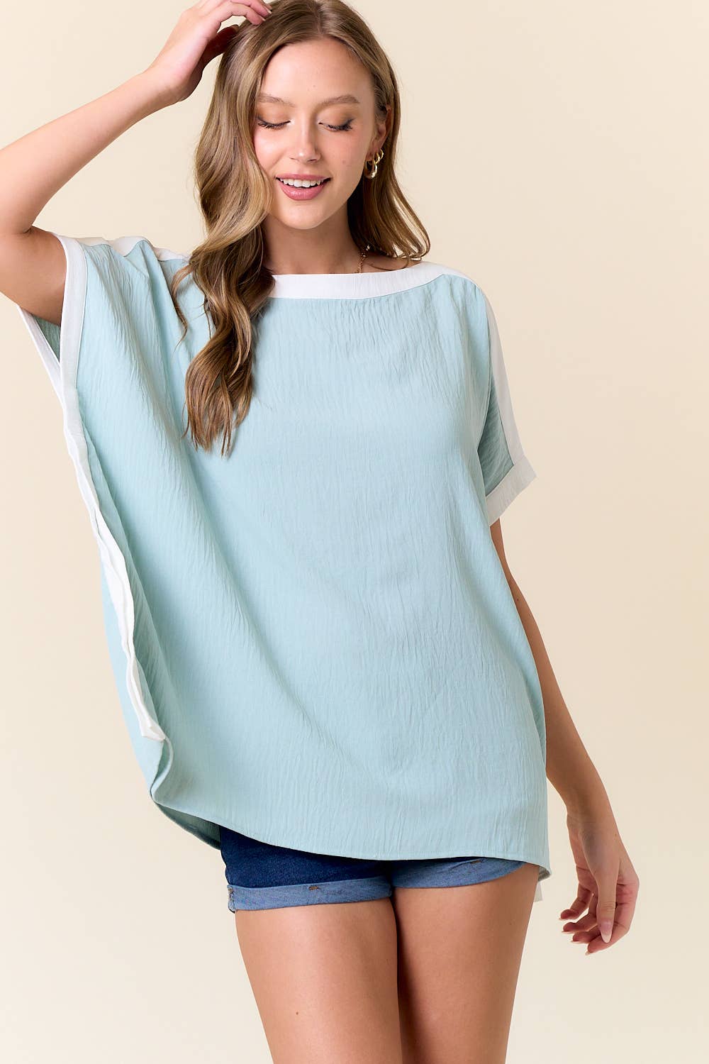 AIRFLOW BOAT NECK CONTRAST BAND TOP - Relaxed-fit boat neck top featuring elegant white contrast banding along neckline and sleeves - Short dolman sleeves with cuffed white trim detail - Oversized silhouette with a graceful drape - Side slits for enhanced movement and styling versatility STYLE MEASUREMENTS (SIZE SMALL) -TOTAL LENGTH 26 1/2" -SHOULDER 31" -BUST 30" 100%POLYESTER | LINING:100%POLYESTER MODEL IS 5'10" | BUST 34" | WAIST 24" | HIPS 35" WEARING SIZE S