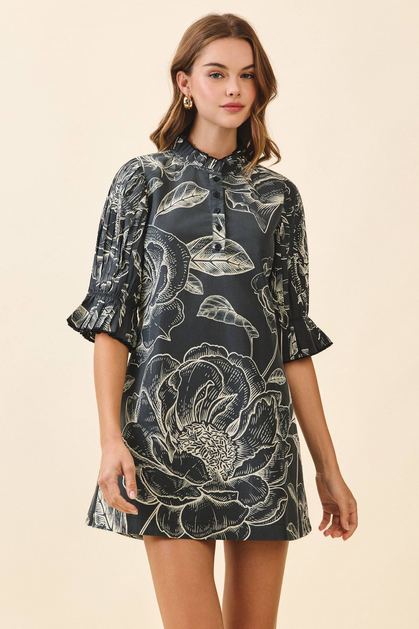 A floral print mini dress featuring a high neckline with ruffle trim and a partial button placket. Designed with elbow-length puff sleeves finished with pleated ruffle cuffs. The relaxed shift silhouette is cinched at the waist with a self-tie sash at the back for a flattering fit. Model Size + Fit: Model height: 5'11" Dress size: Small Bust: 31.5 Waist: 23.5 Hips: 35