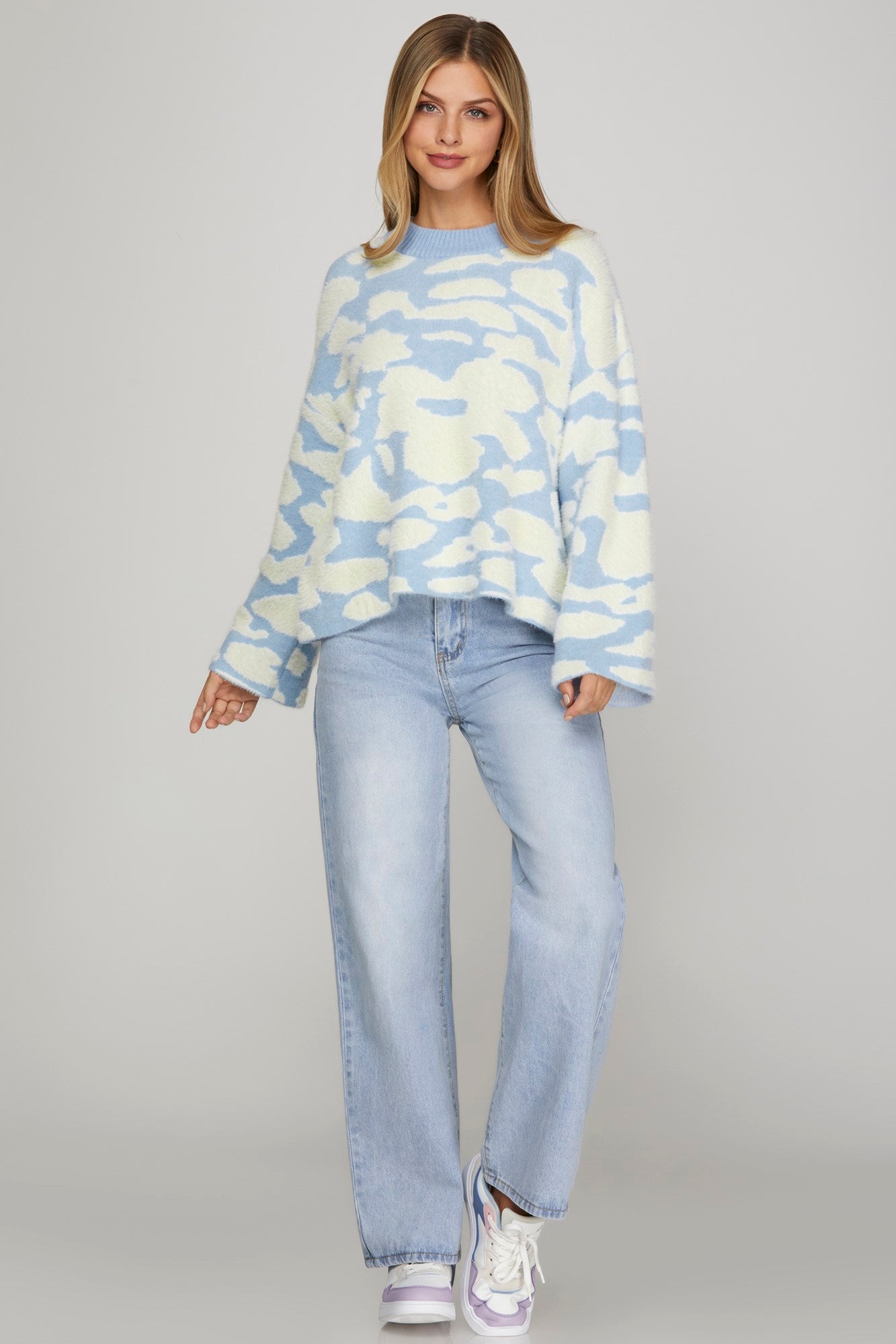 LONG SLEEVE FUZZY FLORAL PRINT SWEATER TOP