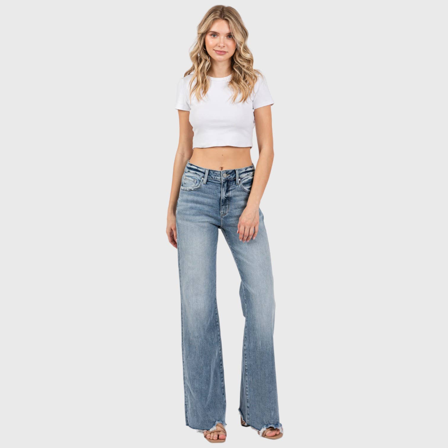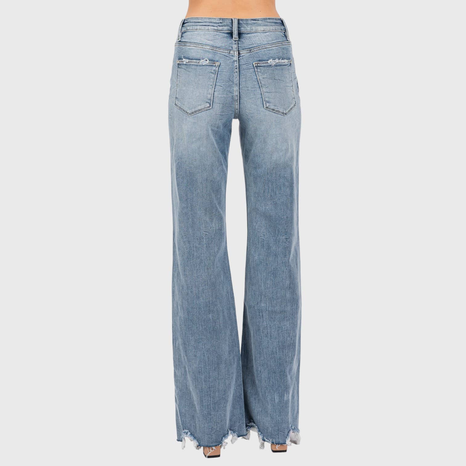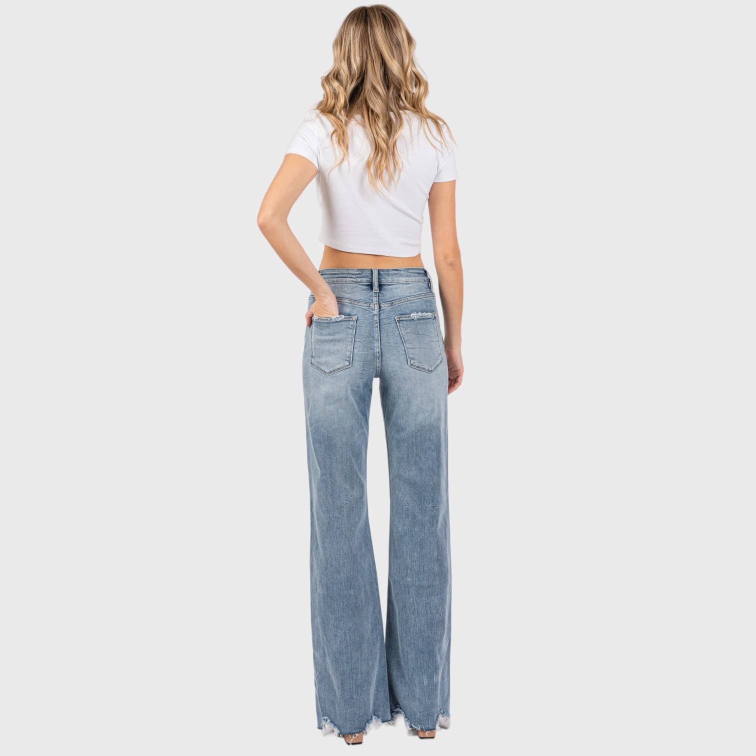 HIGH RISE STRETCH VINTAGE FLARE W/ FRAYED HEM - 10.5" Rise, 32" Inseam, Modeled in size 3/25 - Leg opening : 20.5" - High waisted Vintage Flare jeans - Frayed hem with destroyed - Button closure and zip fly - 5-pocket styling - 89% COTTON, 9% POLYESTER, 2% SPANDEX