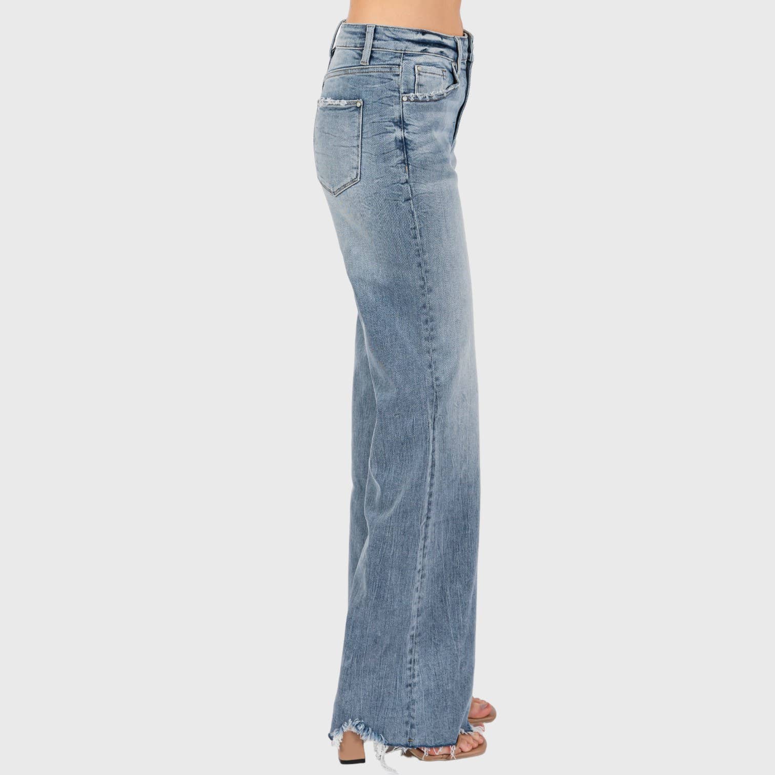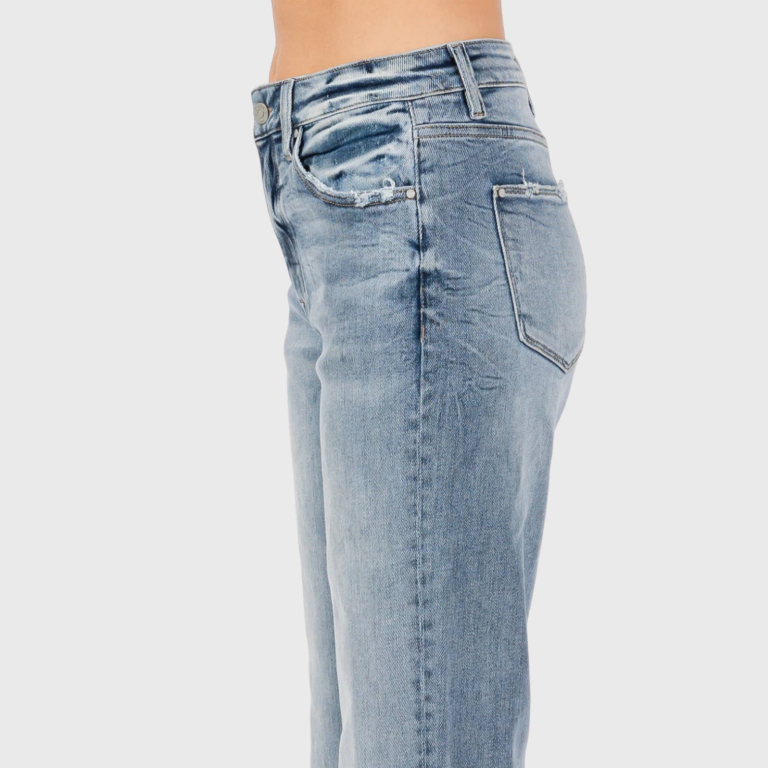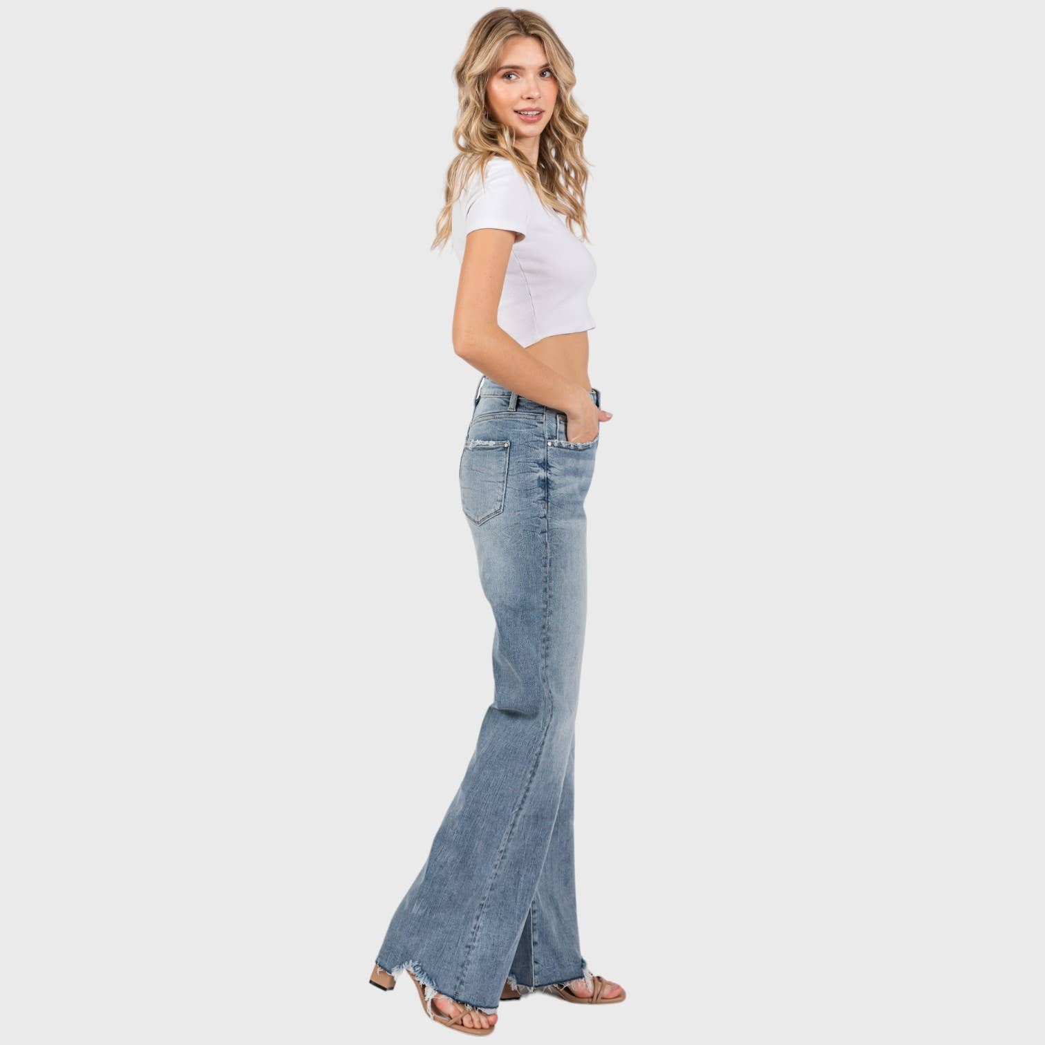 HIGH RISE STRETCH VINTAGE FLARE W/ FRAYED HEM - 10.5" Rise, 32" Inseam, Modeled in size 3/25 - Leg opening : 20.5" - High waisted Vintage Flare jeans - Frayed hem with destroyed - Button closure and zip fly - 5-pocket styling - 89% COTTON, 9% POLYESTER, 2% SPANDEX