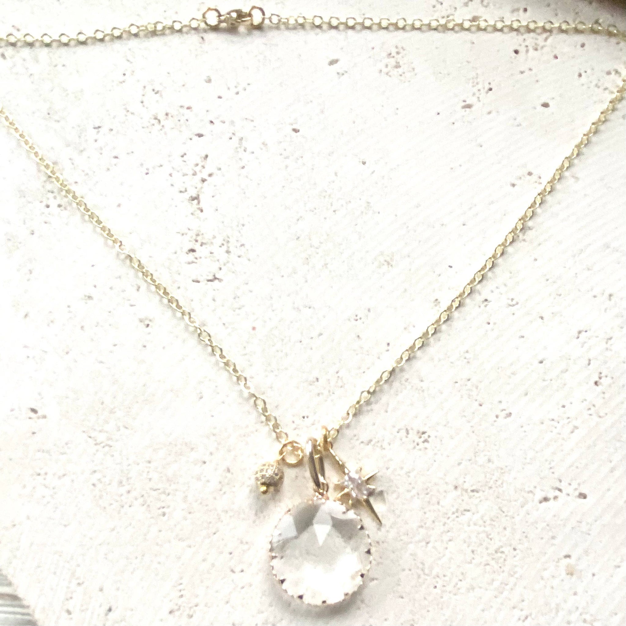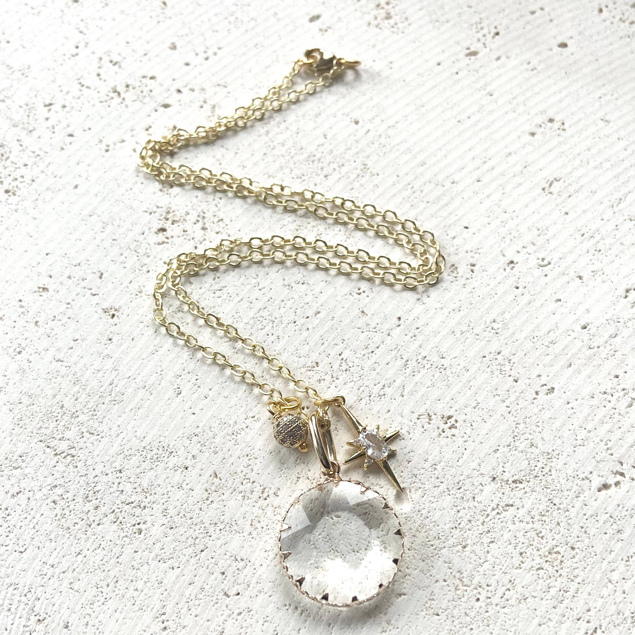 Our crystal sparkly necklace is a must have for your shop! I perfect cluster of sparkly crystal and gold. Non tarnishing gold plated chain. Faceted crystal pendant 28mm .Choose your length Studio Notes: F